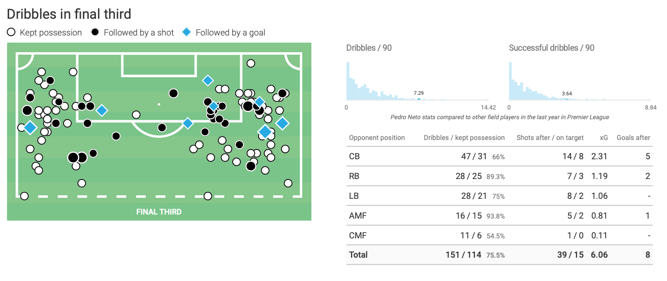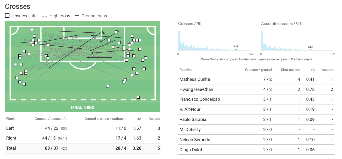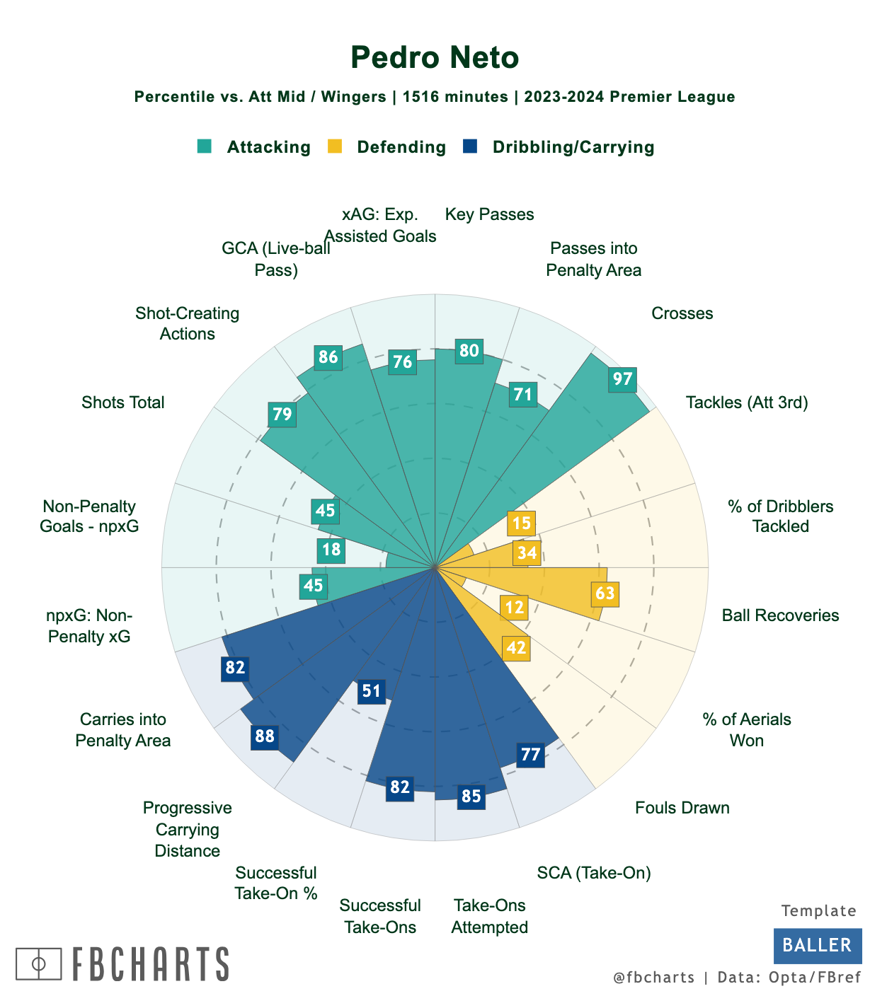 Neto is an otherworldly blend of some of the best qualities of Martinelli (bursting pace down the line, power-carries) and Saka (thoughtful crosses). He is a true threat from both sides and is ideal depth, and prior to some … interruptions … he was firmly in the conversation with Foden and Saka. My big-brain idea is that you can even have him overlapping Saka as a “RWB” against particularly low-blocks; he’s done that kind of thing before.