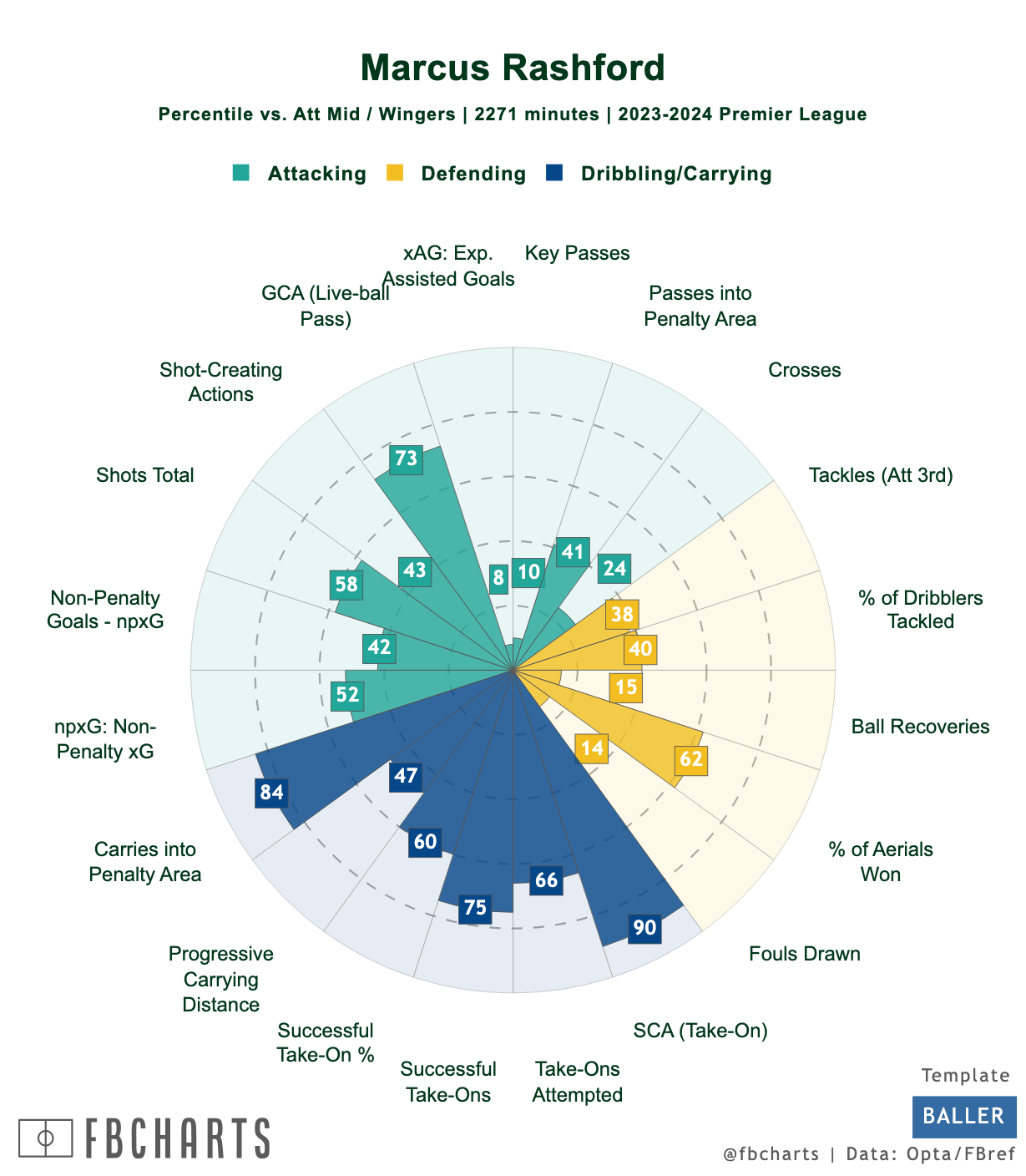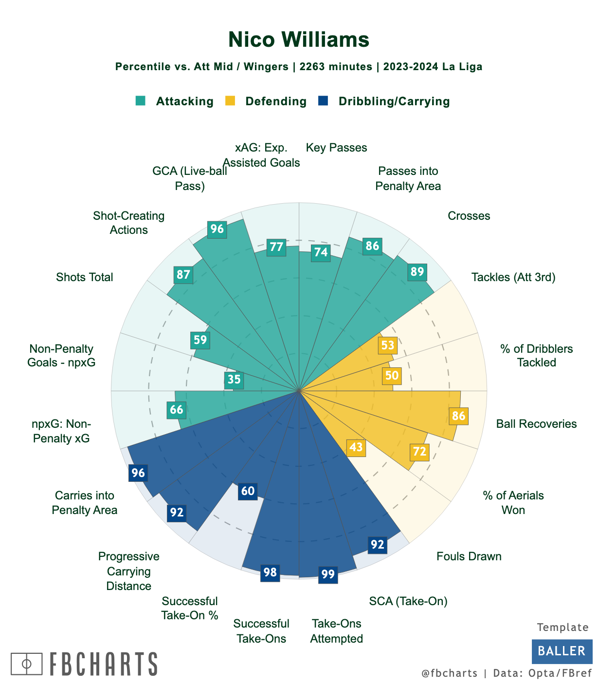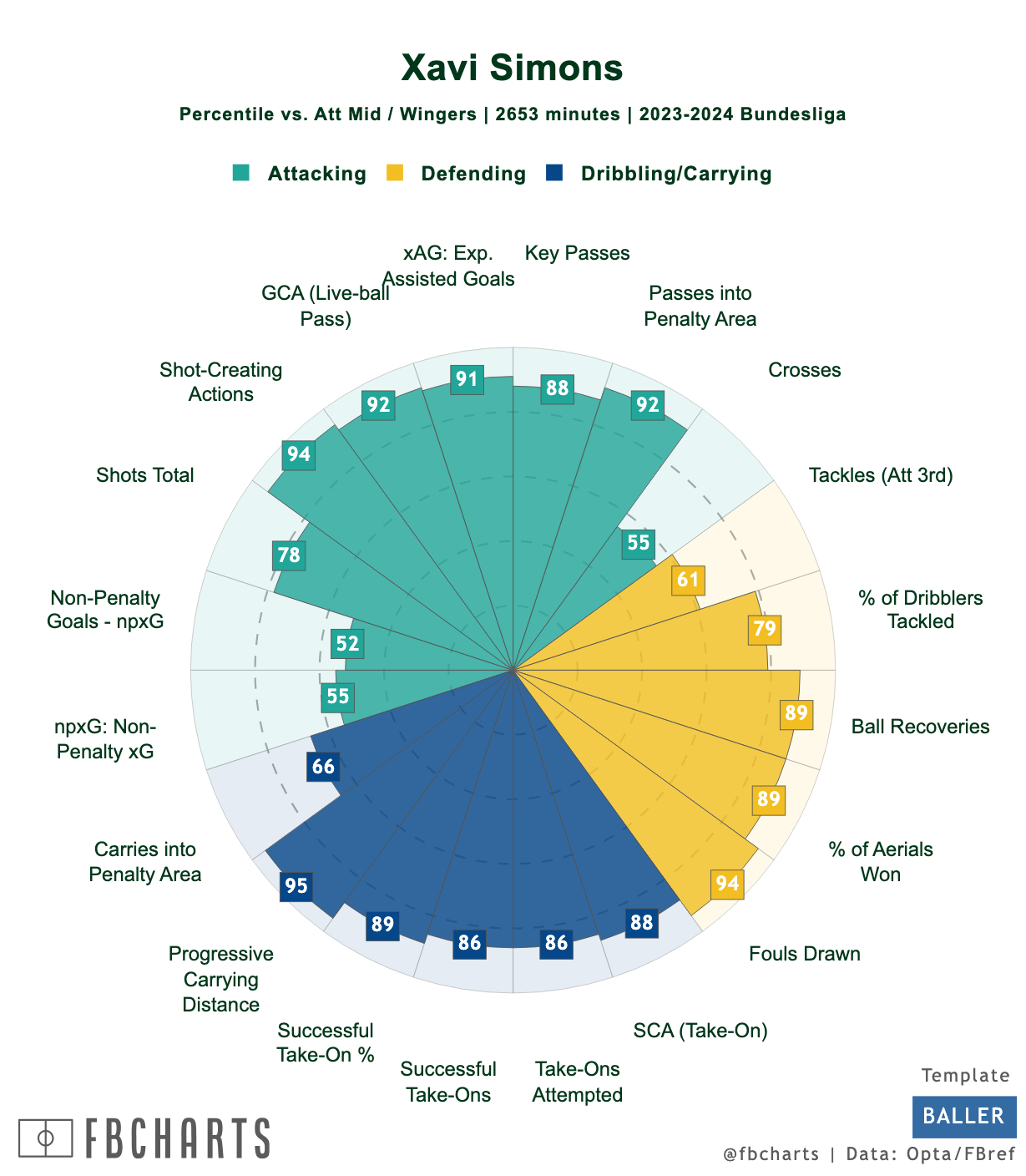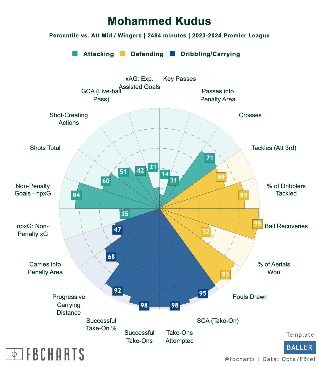 ✅ Group quantitative measures (60%): Dribbles (success and quantity), carries, attacking duels per 90, shots (npxG, quality, etc), shot creation, passes/crosses into the penalty area, advanced tackles, age, minutes played, as well as some aggregate underlying statistics from other providers (like FotMob) to give a base.