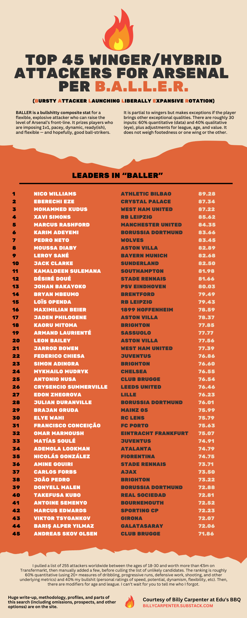 Here's a new bullshit stat to rank dozens of potential winger (and hybrid attacker) signings for Arsenal. Filled with analytics, dozens of player profiles, and more. (Plus, let's talk comps)