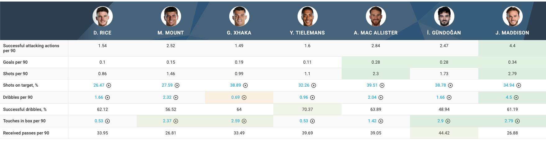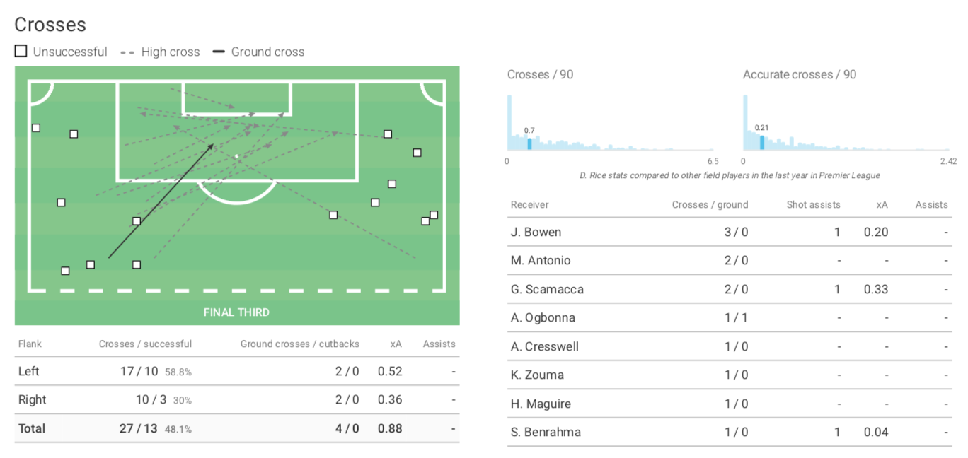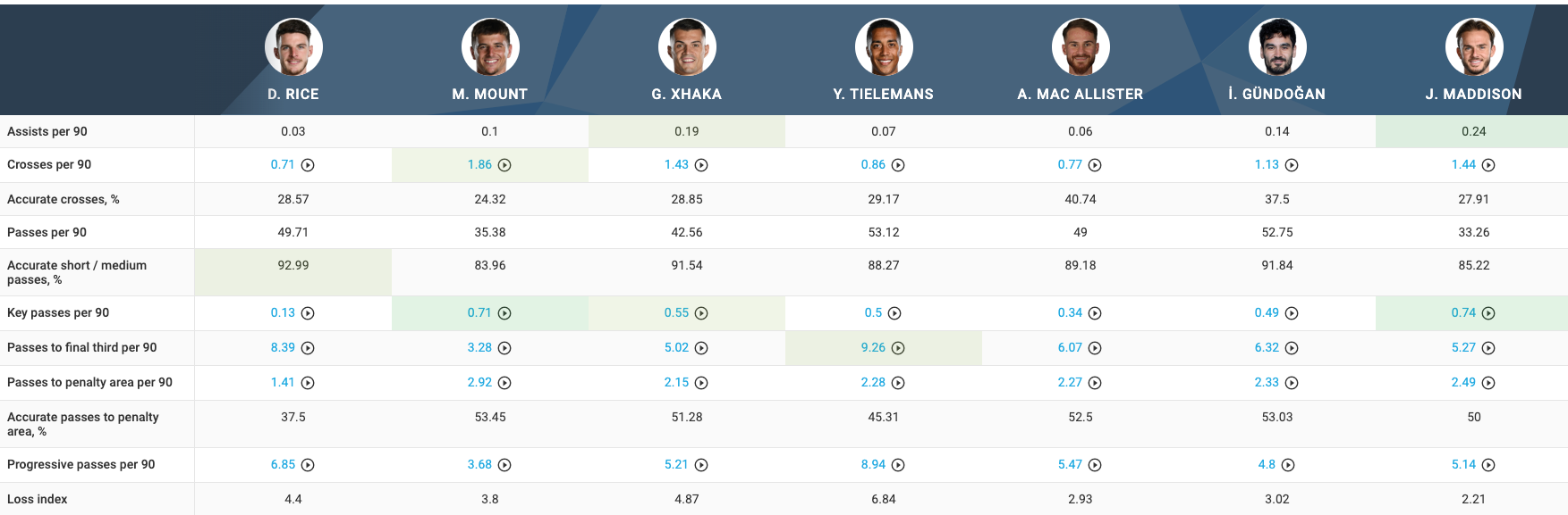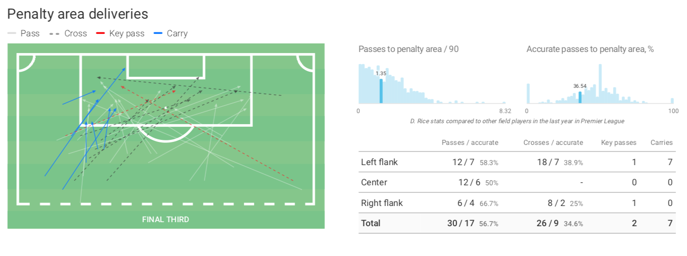 As you’ll see above, Rice has a more progression-heavy role, focused on getting the ball into the final third, while others have more responsibility within that third. Even so, there are still potential flags, namely that “accurate passes to the penalty area” percentage.
