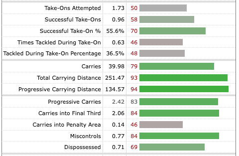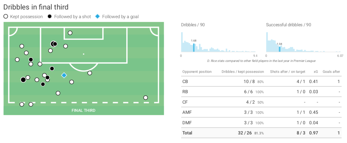 But carrying isn’t always the same as dribbling — and Rice doesn’t have a huge amount of volume in direct take-ons: