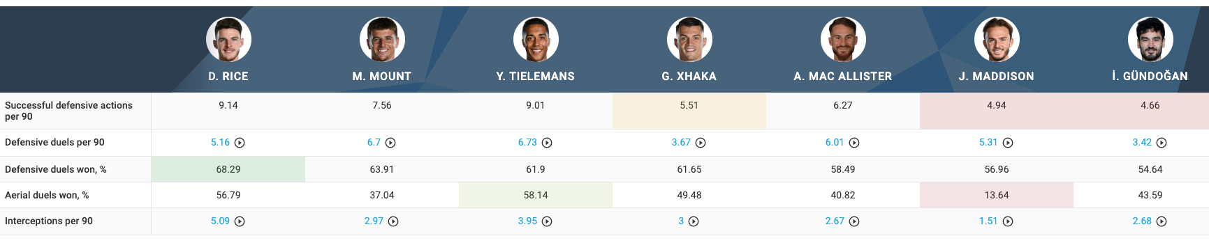 Though Xhaka isn’t the quickest player, he still carries an extraordinary work-rate and a keen sense of positional awareness; put another way, these low numbers are not a product of laziness. So the concern here is that this role is not central enough for a player like Rice to exploit some of his top-tier characteristics.