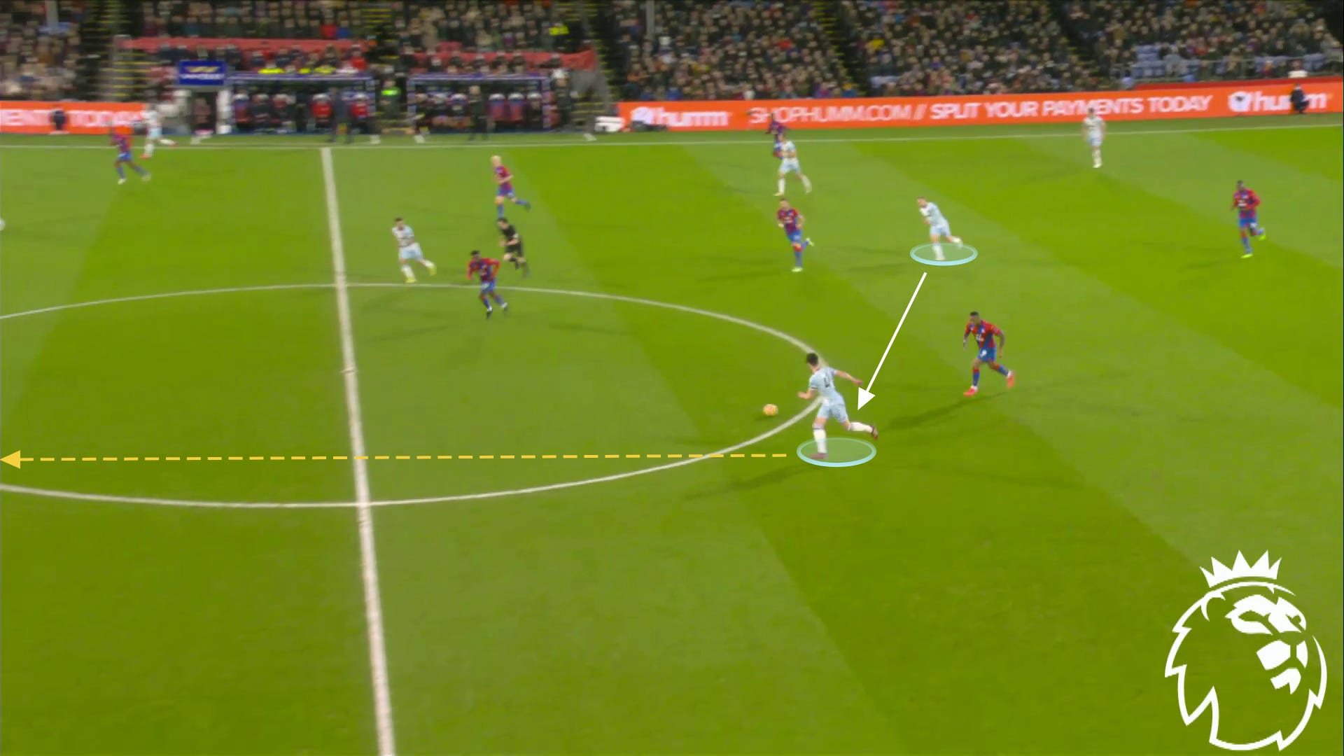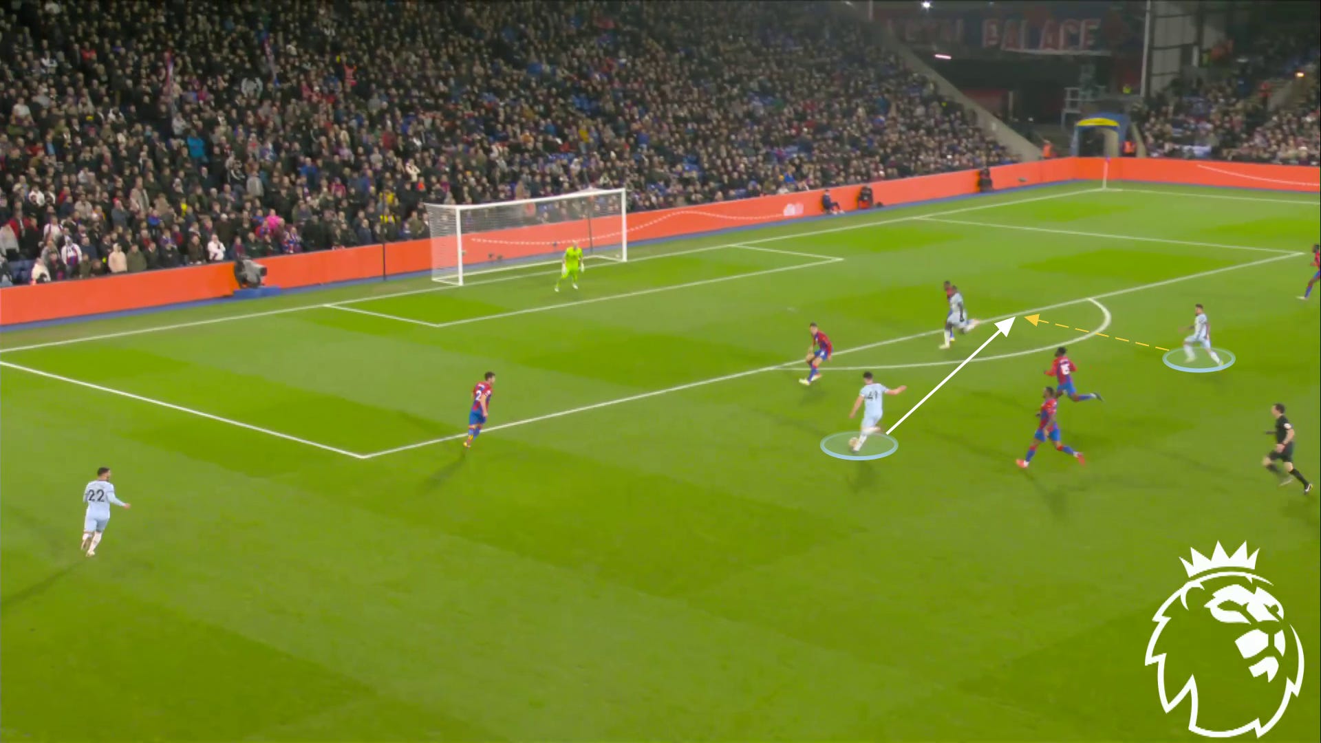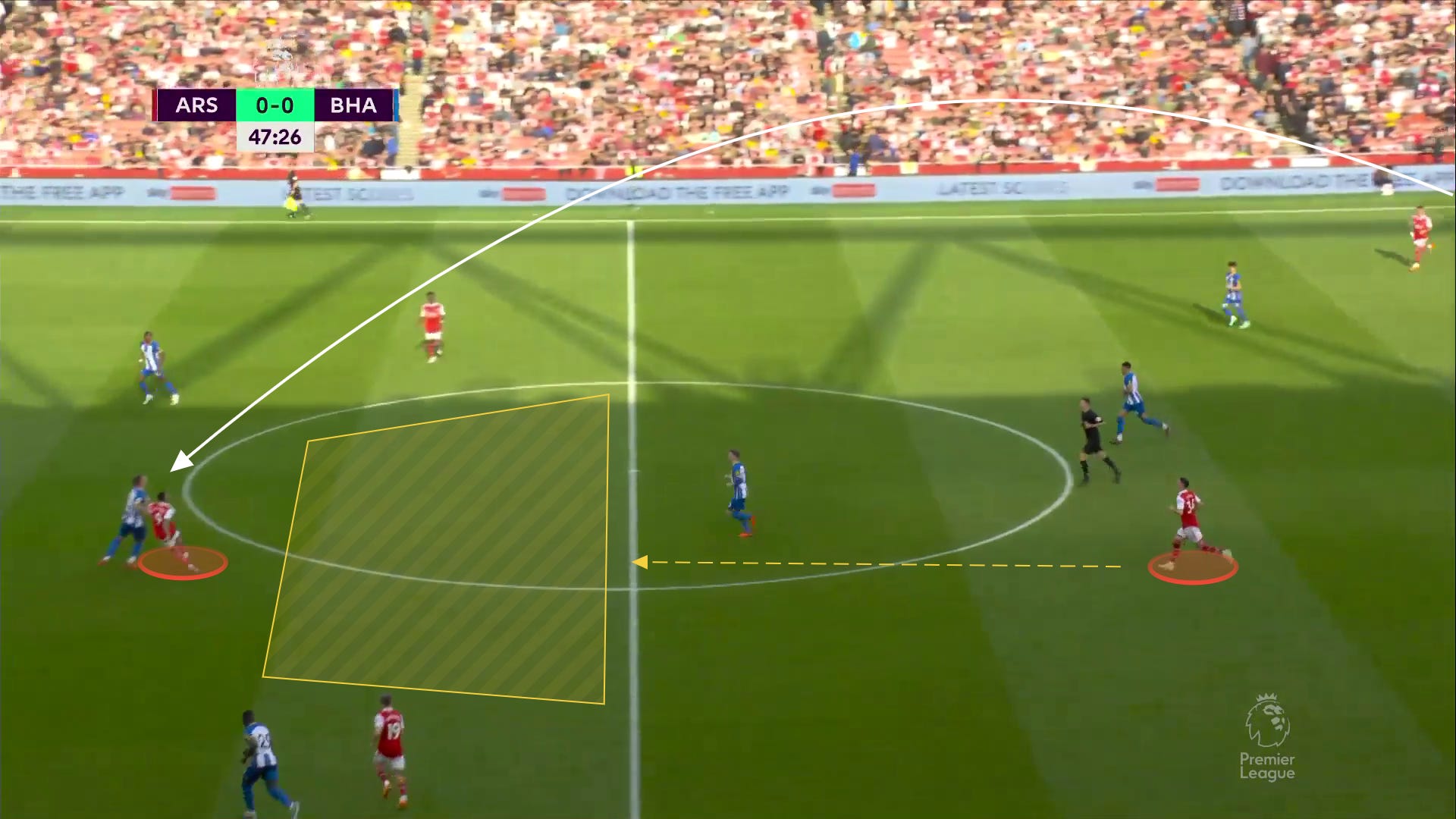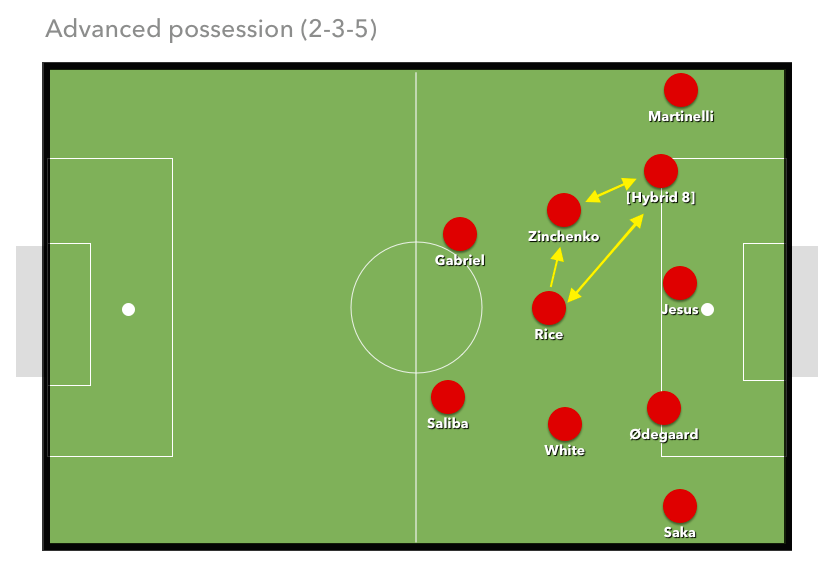 The answer to that is pretty simple: more aggressive and automatic rotation with the left-most pivot, usually Zinchenko, from the first phase on up. With Zinchenko (or Caicedo?) coming over there, they can invade the box and pick out little tricky passes in crowded space, while Rice can hang back, keep the ball pinned, and survey passing opportunities: