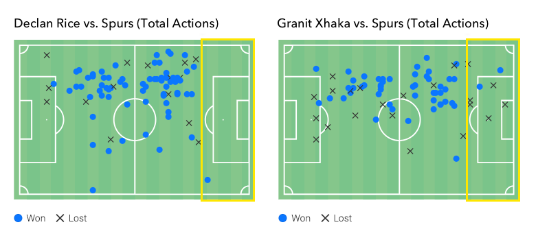 To better understand that phenomenon, I looked up the seasonal averages for actions by Rice and Xhaka, and tried to find the most indicative performances I could. Here are two action maps, against the same dreaded opponent: