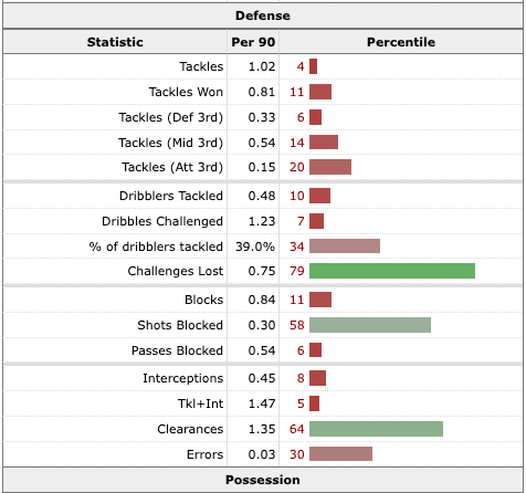 Though it’s not defending, per se, it is worth noting here that Rice leads the league in ball recoveries. In a more advanced role, that would be extra-useful when Ramsdale plays it long and directly up to the 9, as the team likes to do to begin halves (or when there is a mismatch to exploit).